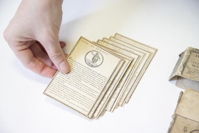 Description : Jeu complet de cartes composé d'une boîte (le corps et son capuchon), des cartes et de la règle du jeu. 48 cartes avec composition typographique et un médaillon gravé en taille-douce.
