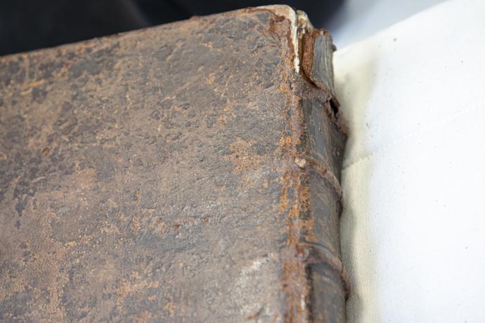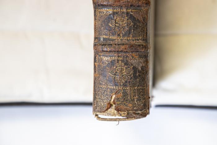 Observations : Reliure abîmée : elle se détache en haut du côté droit de la tranche.
