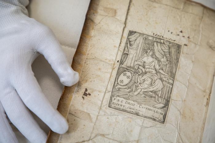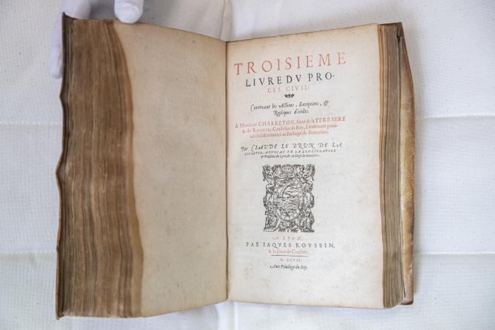 Observations : Le premier volume, à moins d'une coquille à propos de la date, semble avoir été imprimé le dernier. Un privilège, daté du 2 mars 1605, est imprimé à la fin de ce volume qui porte cependant un achevé d'imprimer à la date du 15 janvier 1609. Trois parties en un vol. in 4°. Second livre du procés-civil, Lyon, Jacques Roussin, 1605. Troisième livre du procès-civil, Lyon, Jacques Roussin, 1607. Lettrines, culs-de-lampe, ex libris de F. N. E. Droz. Portrait par Fornareris, grand dépliant bois gravé en fin.