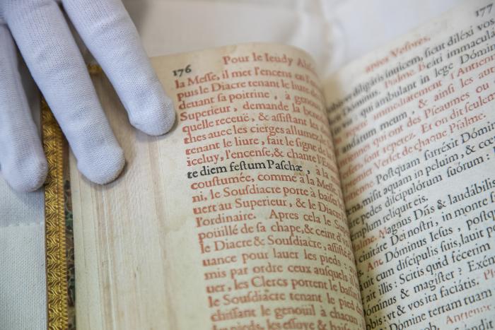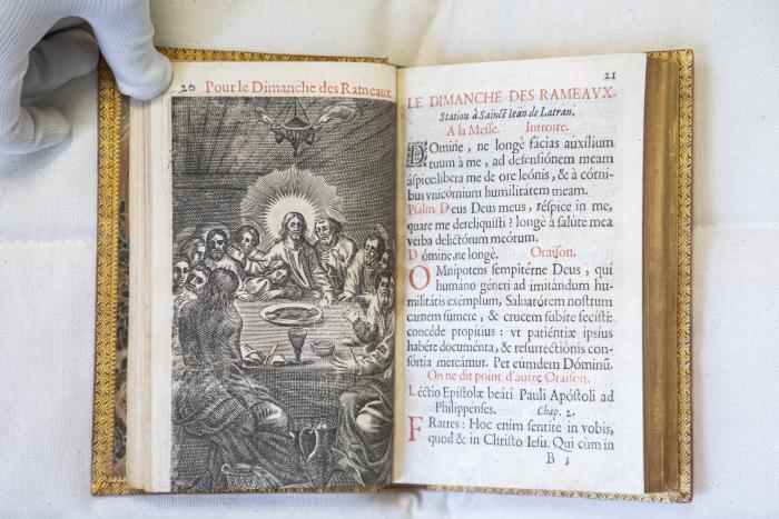 Description : Titre complet : L'office de la Semaine Saincte selon le Missel et Bréviaire romain imprimé par le commandement de Pie V et reveu par l'authorité de Clément VIII, suivi de : Office de la nativité de Nostre Seigneur. Devant chaque partie, on trouve des gravures en taille-douce.