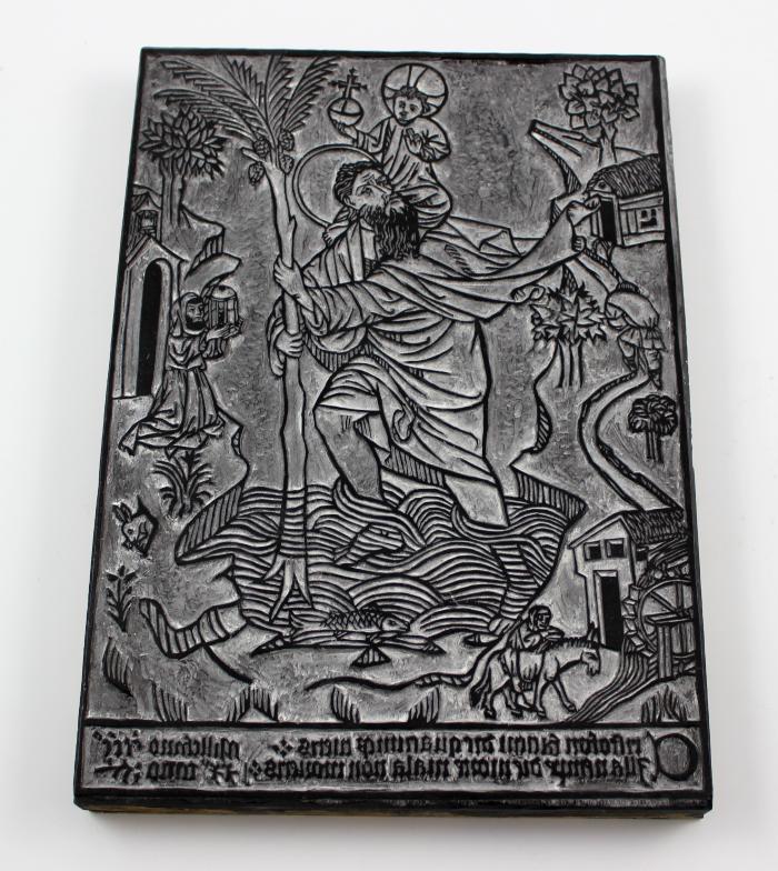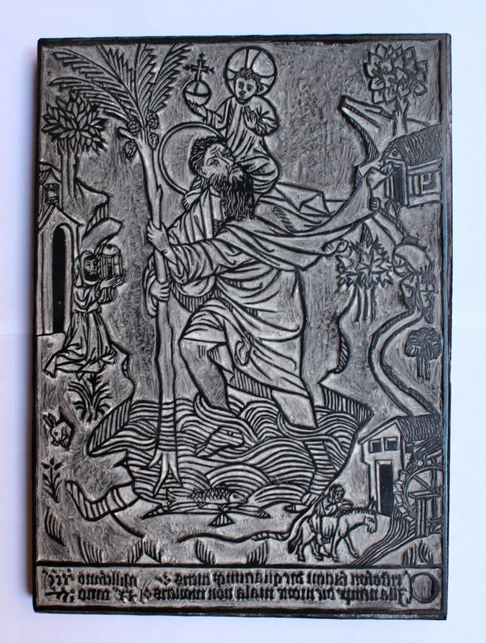 - Bois gravé en taille d'épargne à la manière du XVe siècle. Reproduction du "Saint Christophe" de la collection Spencer, datant de 1423