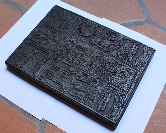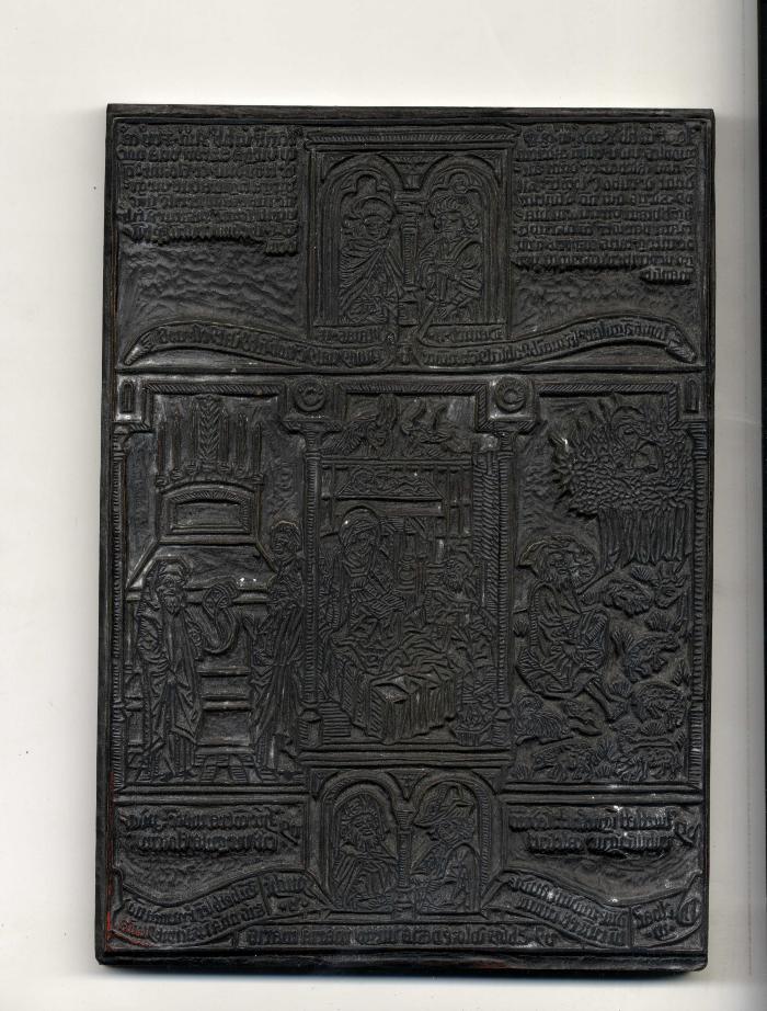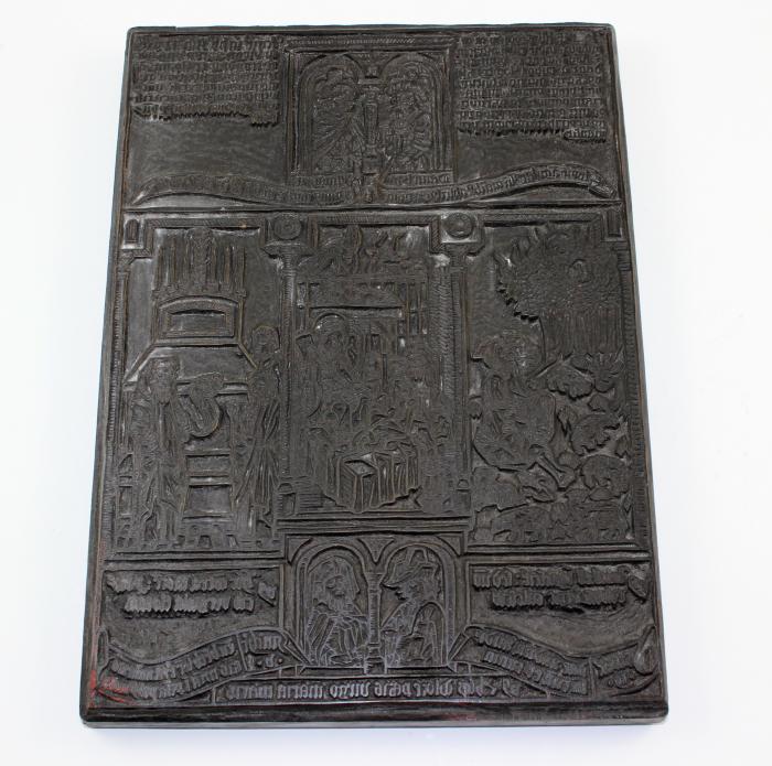 Observations : Xylographie reproduisant une page d'une "Bible des Pauvres" conservée à la bibliothèque nationale. Avec épreuve. Cf. dossier d'inventaire : documents concernant livres tabellaires.