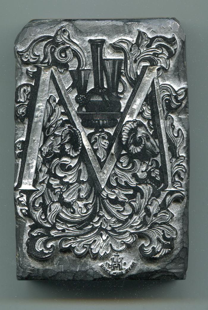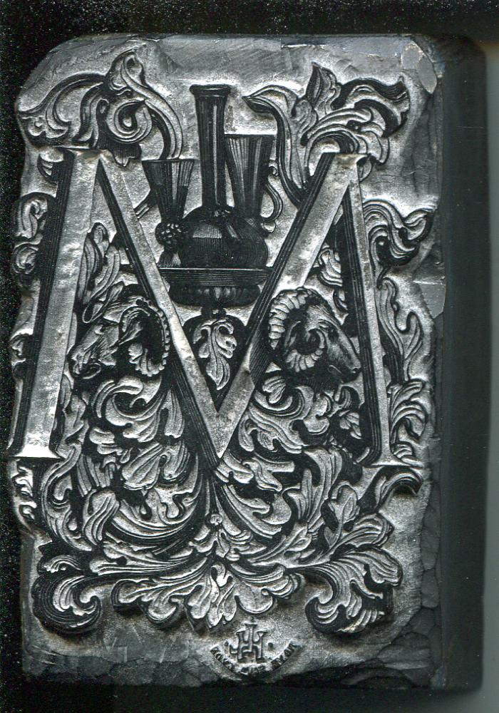 Titres d'objets : Deux bois gravés : emblême de Lyon + lettre historiée (M)