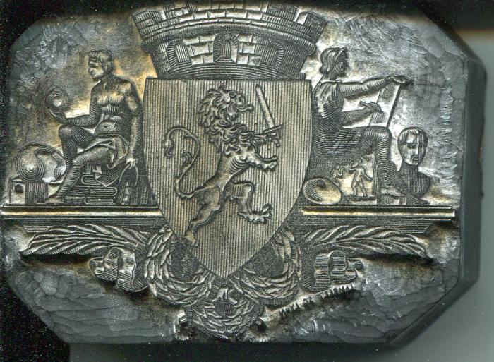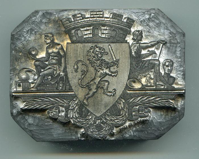 Observations : 1 bois représentant l'emblême de Lyon marqué "Lambert Sculpsit" : blason de Lyon, symbole de la ville surmonté de deux créneaux et entouré de deux figures allégoriques (à gauche les sciences, à droite l'architecture ou la sculpture). (8 x 6 cm). Un bois supplémentaire représentant une lettre, le M.