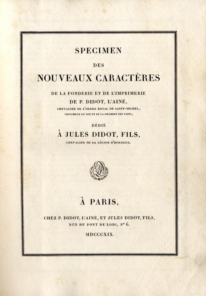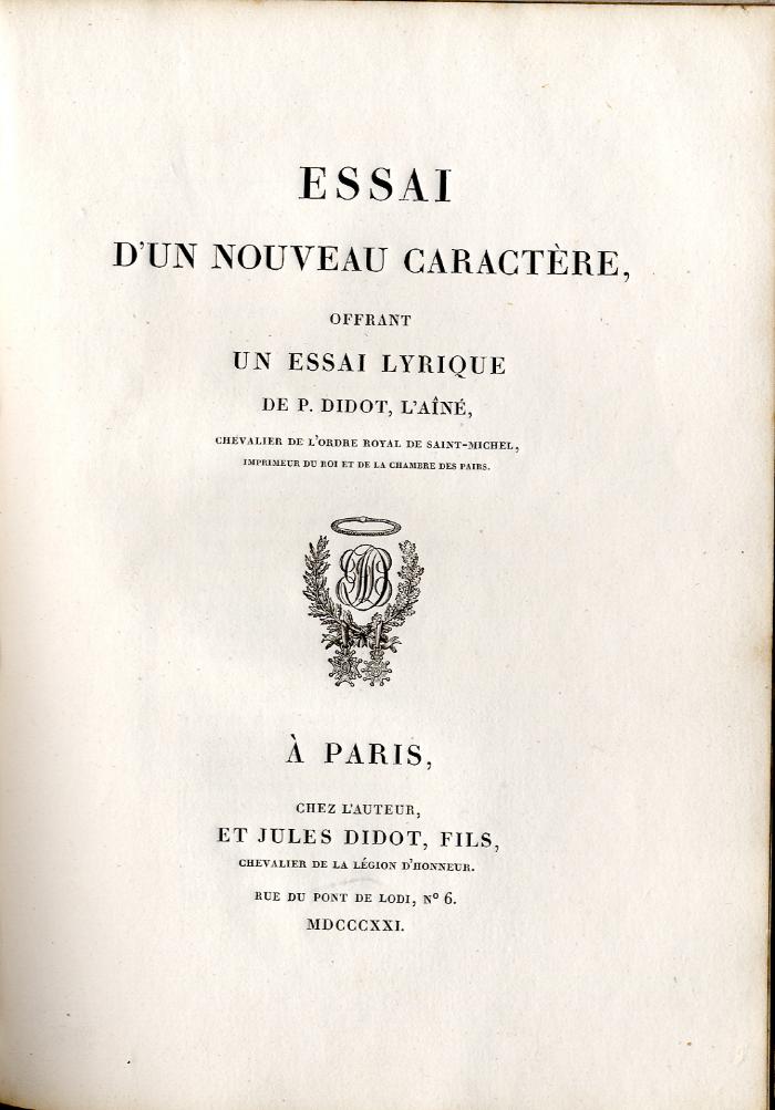 - Spécimen des nouveaux caractères de la fonderie et de l'imprimerie de P. Didot, l'Aîné. Relié avec P. Didot, "Essai d'un nouveau caractère offrant un essai lyrique de P. Didot, l'aîné"
