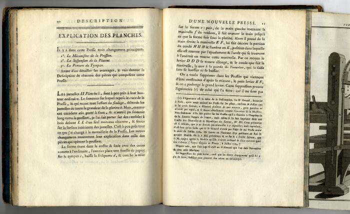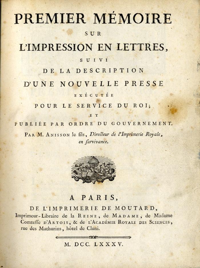 Observations : A Paris, de l'Imprimerie de Moutard, Imprimeur-libraire de la Reine, de Madame, de Madame Comtesse d'Artois, & de l'Académie Royale des Sciences, rue des Mathurins, hôtel de Cluni. Ex-libris: Henri Caillière Ouvrage doté de plusieurs planches descriptives de la presse créée par Anisson. Relié au mémoire: Description d'une nouvelle presse d'imprimerie (…) par M. Pierres, premier imprimeur ordinaire du Roi, Paris, Imprimé chez l'auteur, par sa Nouvelle Presse, 1786. Notice revue: 2008 OPAC de la Bibliothèque municipale 000474