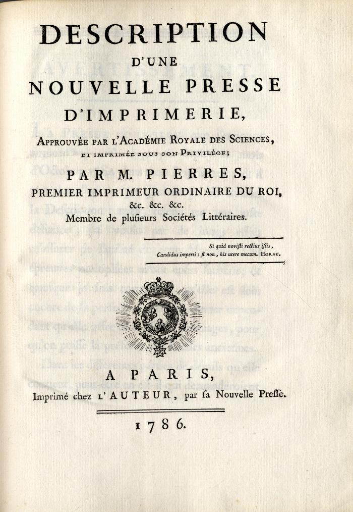 Titres d'objets : Premier mémoire sur l'impression en lettres suivi de la description d'une nouvelle presse exécutée pour le service du Roi ; et publiée par ordre du gouvernement; Description d'une nouvelle presse d'imprimerie (…) par M. Pierres, premier imprimeur