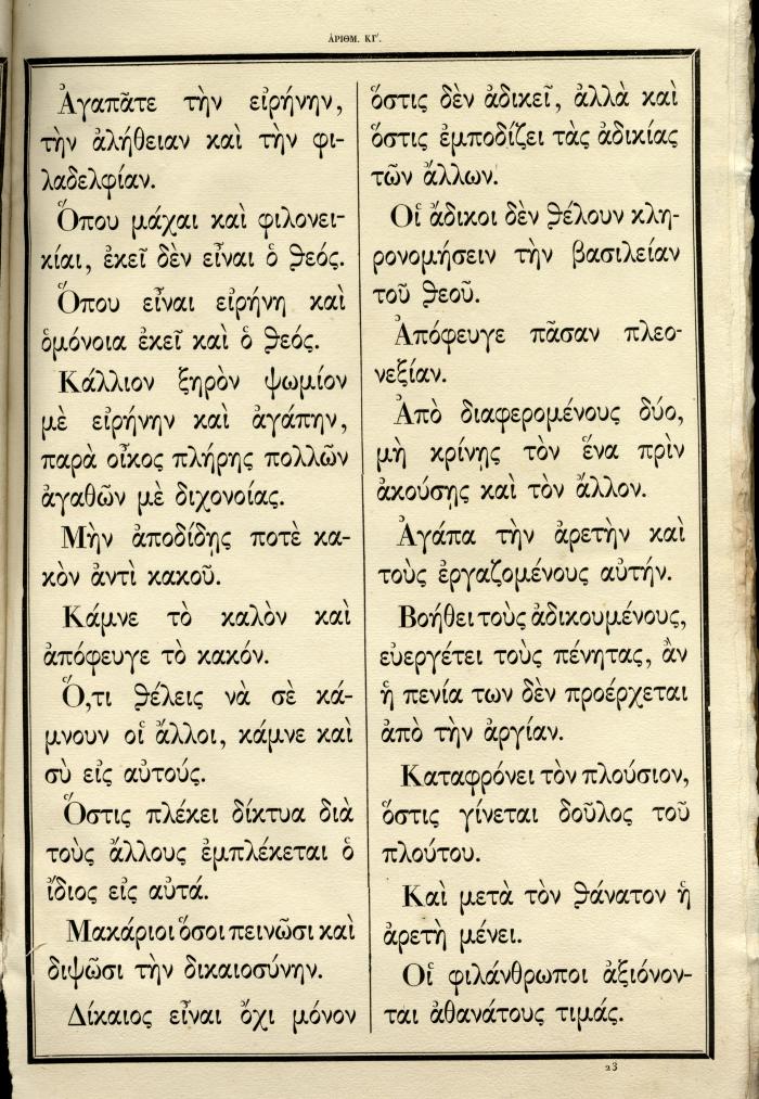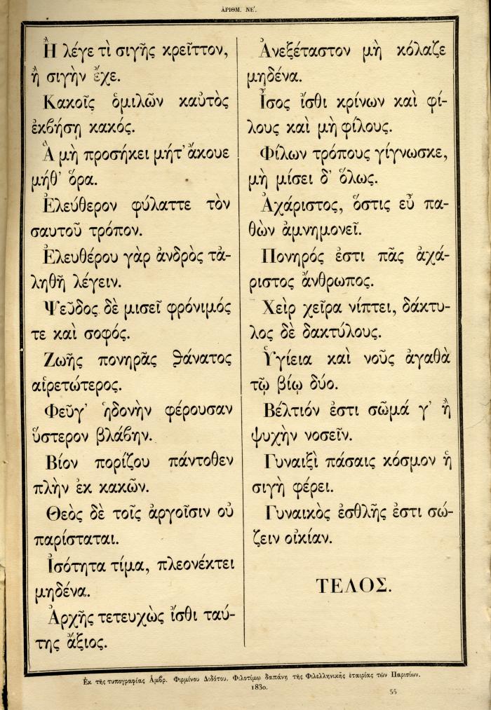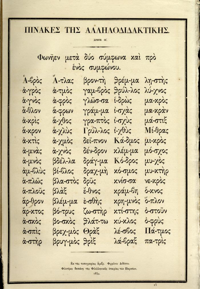 Observations : Couverture brochée. 56 feuilles. Impression recto seul en caractères grecs sur papier chiffon. Belle impression en caractères grecs de Didot. « Allilodidaktiki » est un mot composé qui signifie « enseignement réciproque » ou « enseignement mutuel ». Il s’agit vraisemblablement d’un ouvrage de Lydia Papadaki intitulé en traduction française Méthode d’enseignement par les pairs en Grèce au 19e siècle. Il a existé de telles méthodes d’« enseignement par les pairs » peut-être même dès l’époque byzantine (avec des jeux de question-réponse).