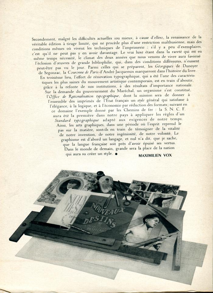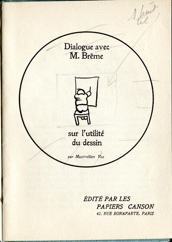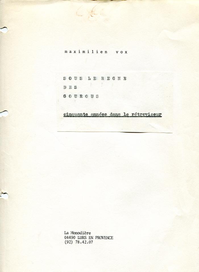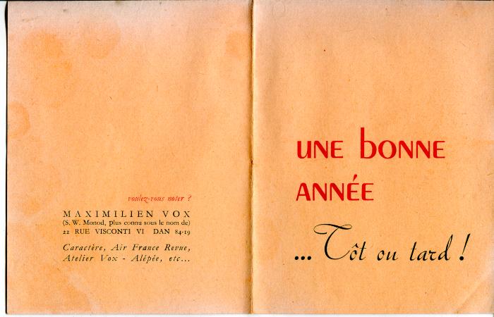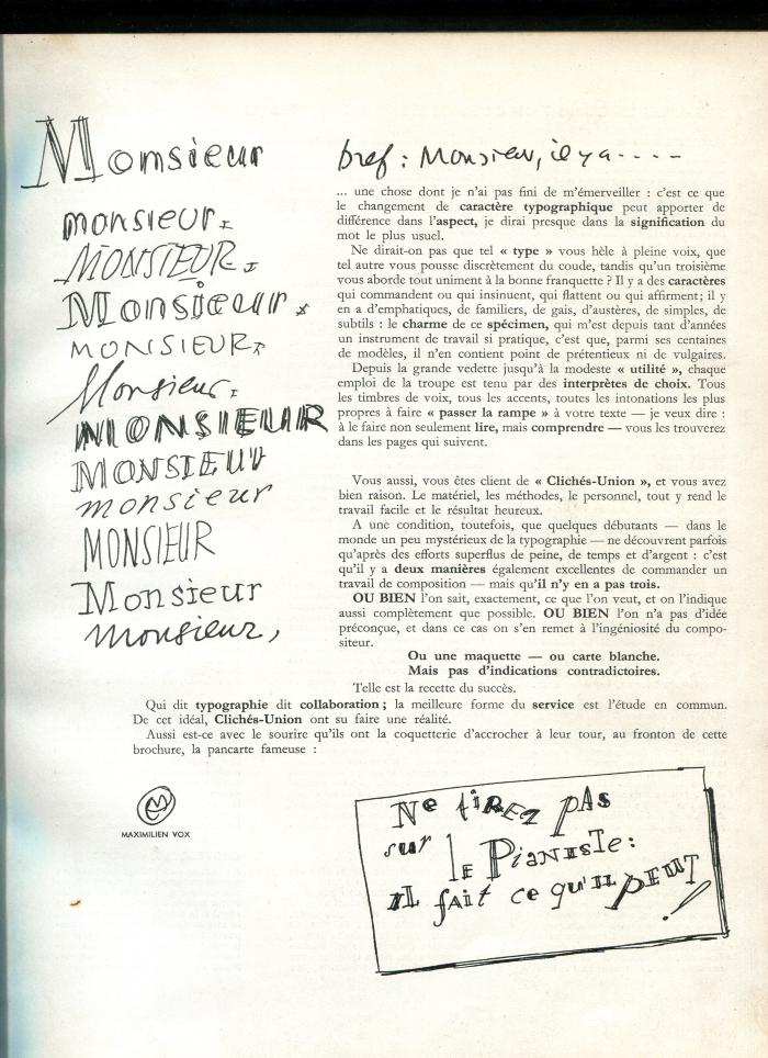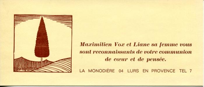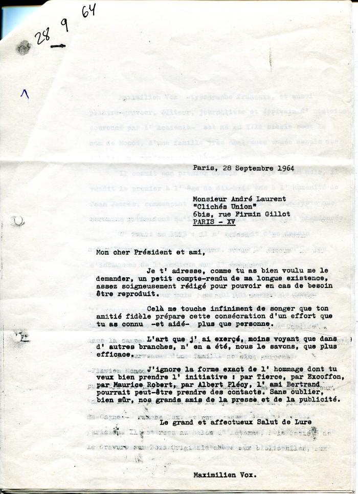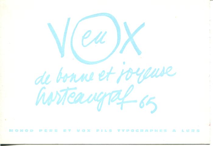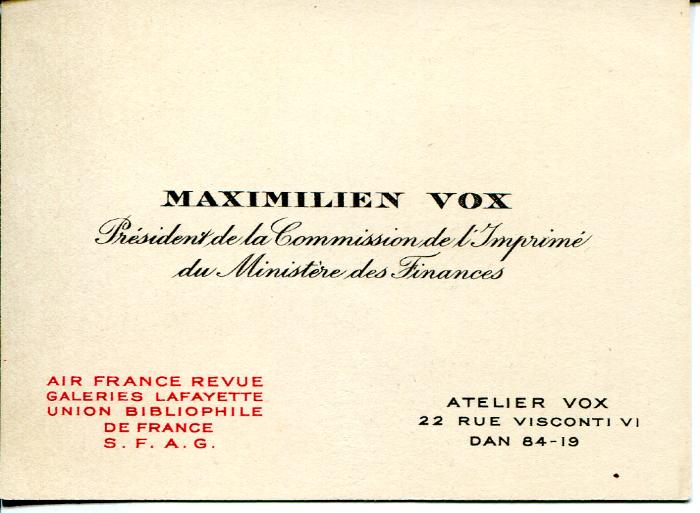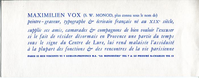 Observations : Maximilien Vox, né Samuel William Théodore Monod (1894-1974) fut dessinateur, caricaturiste, graveur, illustrateur, éditeur, journaliste, critique d'art, théoricien et historien de la lettre et de la typographie française. Il était le fils du pasteur Wilfred Monod (1867-1943) et le frère du naturaliste Théodore Monod (1902-2000). Après des débuts comme caricaturiste et dessinateur de presse (Floréal, L’Humanité), Vox se tourne vers l’édition. Il fonde sa propre maison d’édition, Le Jardin de Candide, puis travaille comme graveur, maquettiste, illustrateur et directeur artistique pour de nombreuses grandes maisons : Grasset, Plon, Union bibliophile de France, Larousse, Denoël… Il dessina le logo de la collection de romans policiers Le Masque ainsi que les lettrines du Grand Larousse du XXe siècle. En 1936, il rédigea la première version de son Standard typographique pour les chemins de fer Paris-Lyon-Méditerranée (PLM), considéré come l’un des premiers « chartes graphiques » français. Deux ans plus tard il dessine le logo pour la nouvelles SNCF, adaptant son Standard typographique aux besoins de la nouvelle société. Au lendemain de la Deuxième Guerre mondiale il créé la revue professionnelle Caractère dont le numéro de noël rassemble toutes les nouveautés typographiques, techniques et graphiques de 1951 à 1964. En 1952, avec Jean Garcia, Jean Giono, Lucien Jacques, Robert Ranc, il fonde à Lurs-en-Provence Rencontres internationales de Lure, qui réunit chaque année des spécialistes de la typographique, due design graphique, de l’imprimerie et du livre. En 1970, il rédigea ses mémoires, restés inédits à ce jour. Maximilien Vox exerça le métier de directeur artistique pour de nombreuses sociétés (dont notamment les Galeries Lafayette). Il fut également l’auteur de nombreux articles sur l’ensemble des métiers du livre. Maximilien Vox a laissé son nom au système de classification des caractères typographique qui, agréé par l’Association typographique internationale (ATypI), devient classification Vox-AtypI en 1962 et sera adopté comme norme internationale. Cet ensemble de documents concernant la vie et les activités graphiques de Vox vient compléter les fonds Fernand Baudin (don 1998) et les archives des Rencontres internationales de Lure (dépôt).