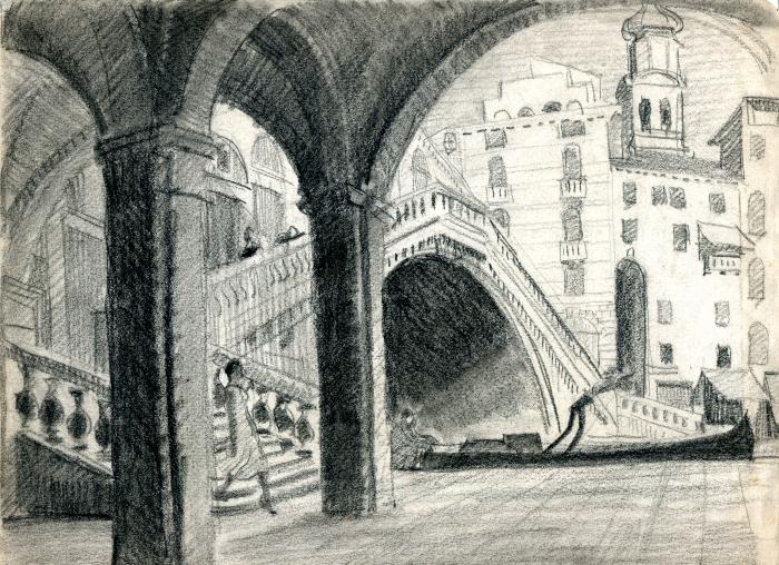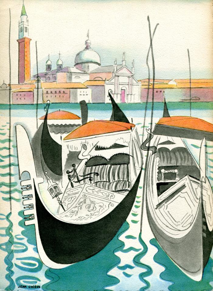 - 12 - Pochette : Venise : Dessins préparatoires au crayon et à l'encre représentant l'architecture et les arts locaux, des vues de gondoles, des paysages, des scènes et personnages du folklore local. Remarque : Certains sont légendés et tamponnés : Jean Chièze. Aquarelles représentant des vues vénitiennes diverses. Remarque : Certaines sont légendées et tamponnées : Jean Chièze. Epreuve d'une vue de Venise par un autre artiste. Documentation diverse (publicités illustrées, cartes)
