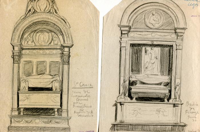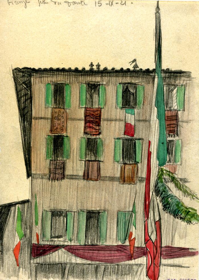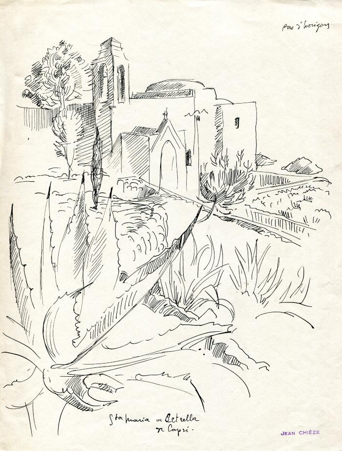 - 13 - Pochette : Italie : Histoire de l'Art : Dessins préparatoires au crayon dont certains de couleurs représentant divers aspects de l'Art italien : scuplture, architecture, et des personnages et scènes folkloriques. Remarque : Certains sont légendés et tamponnés : Jean Chièze.