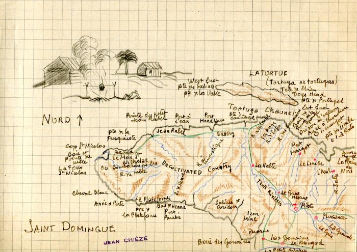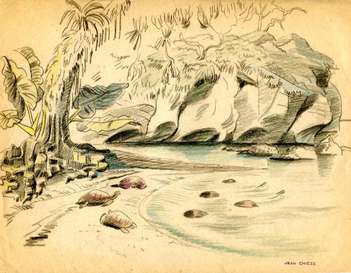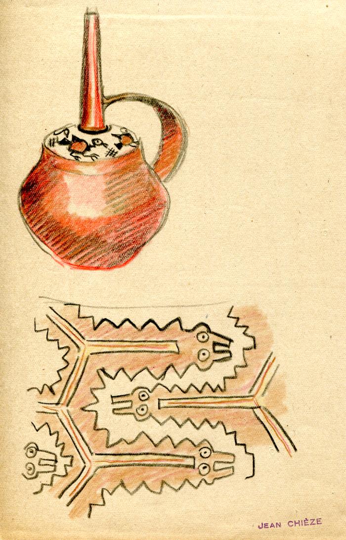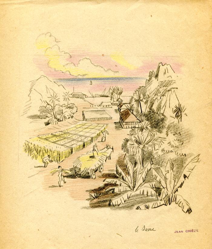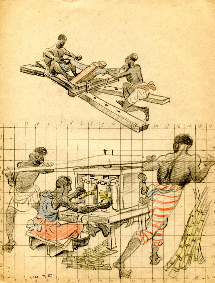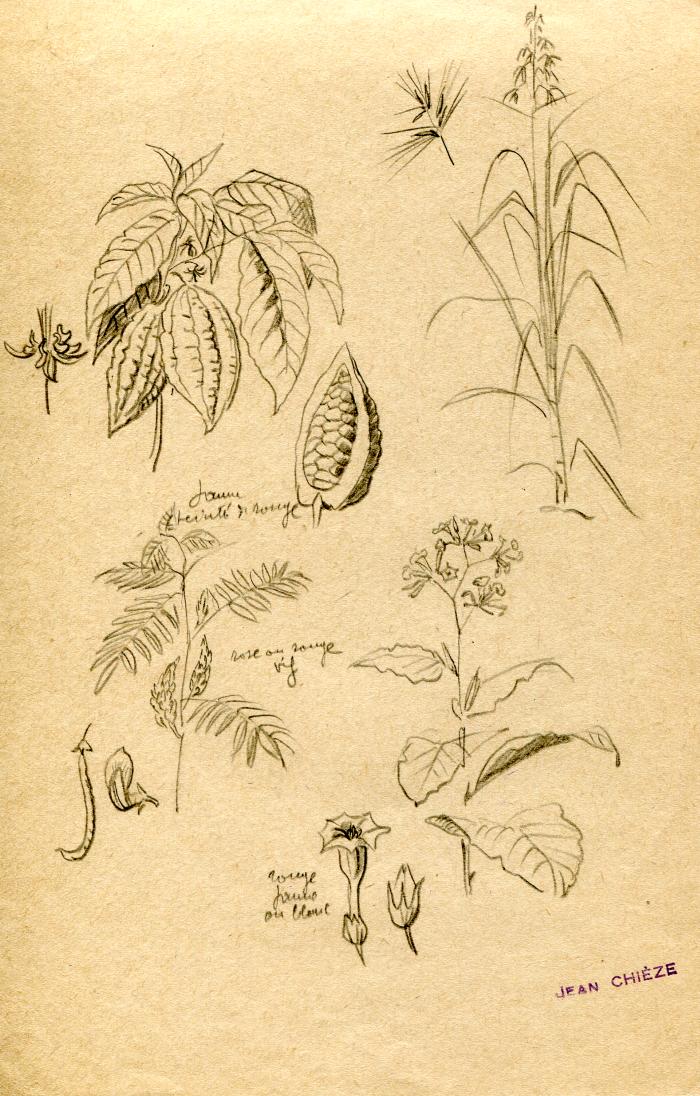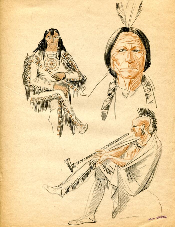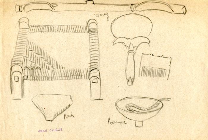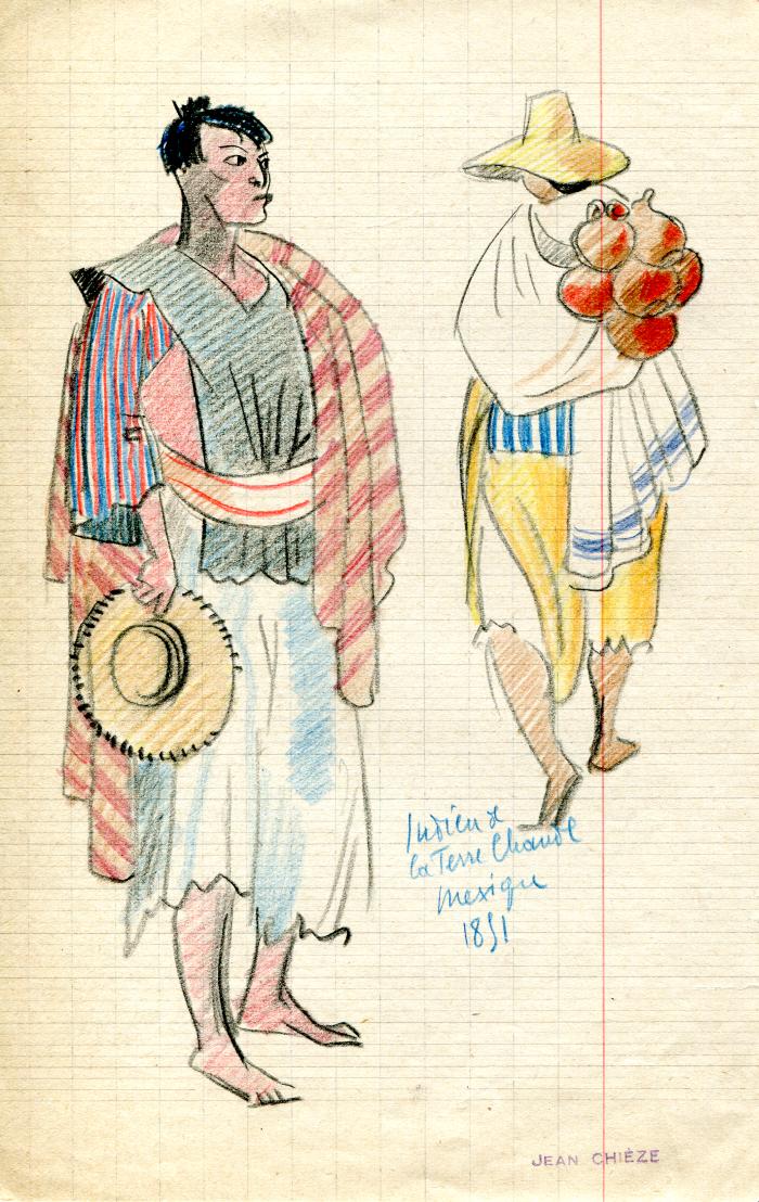 - 17 - Pochette : Amérique : Dessins préparatoires au crayon dont certains de couleurs représentant la population locale de diverses époques soit des cow-boys, indiens, peuples d'Amérique Centrale, esclaves, mais aussi des portraits de bourgeois costumés ; ainsi que des scènes de vie courante, des outils, des objets, l'art local ou encore des paysages, la faune et la flore locales et des cartes géographiques détaillées. Remarque : Certains sont légendés et tamponnés : Jean Chièze.
