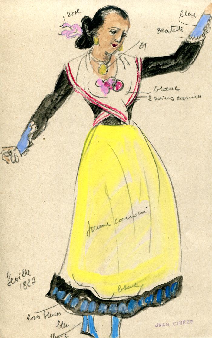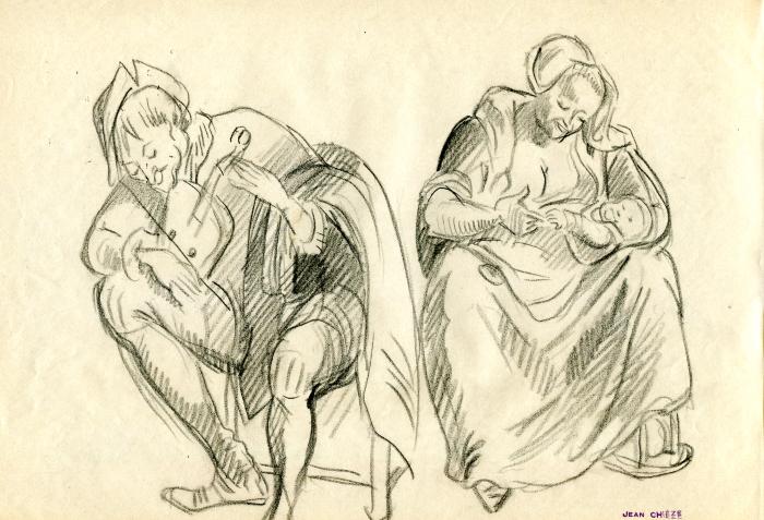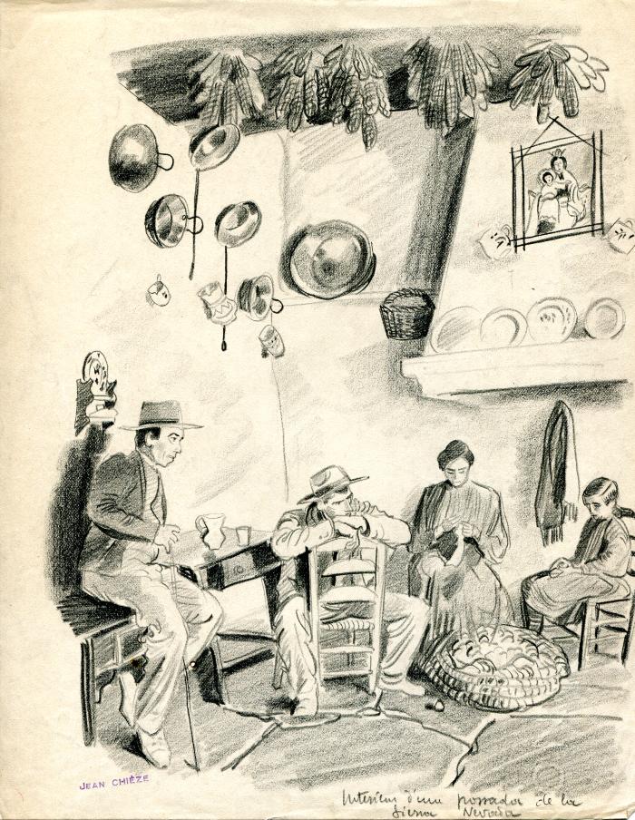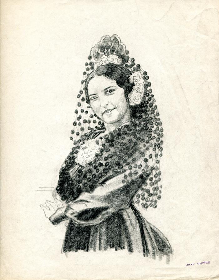 - 10 - Pochette : Espagne : Dessins préparatoires au crayon parfois rehaussés de peinture représentant des scènes et activités de la vie locale, et des portraits d'habitants costumés selon le folklore espagnol. Remarque : Certains sont légendés et tamponnés : Jean Chièze.