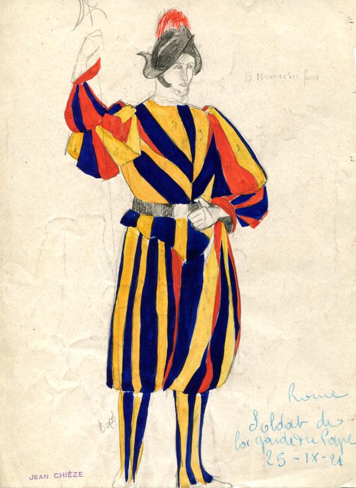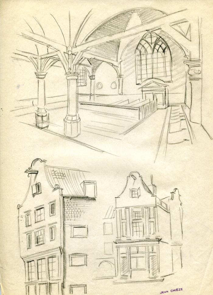 - 6 - Pochette : Pays- Bas : Dessins préparatoires au crayon dont certains de couleurs représentant des scènes avec des personnages costumés d'époques, des blasons, sculptures, et monuments locaux. Remarque : Certains sont légendés et tamponnés : Jean Chièze.