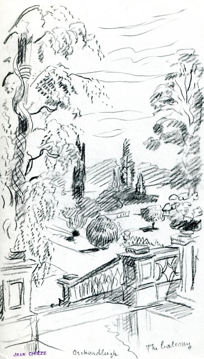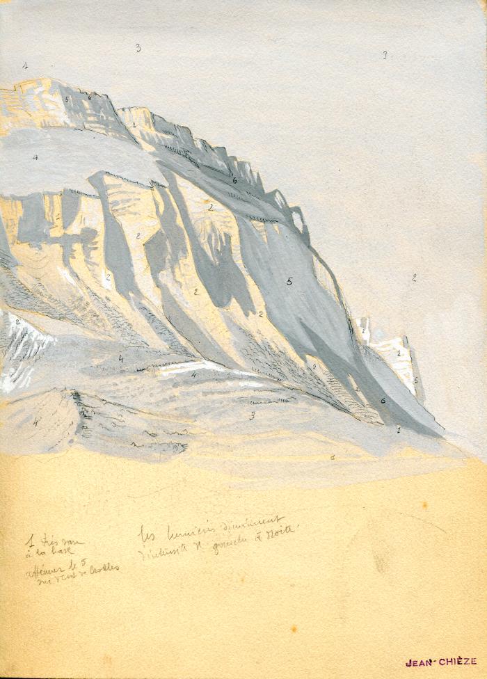 - 8 - Pochette : Angleterre : Paysages : Dessins préparatoires au crayon dont certains de couleurs représentant des paysages, jardins et sites architecturaux. Remarque : Certains sont légendés et tamponnés : Jean Chièze. Gouache représentant des falaises. Remarque : Elle est légendée et tamponnée : Jean Chièze.