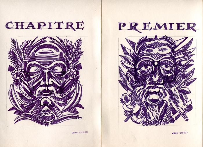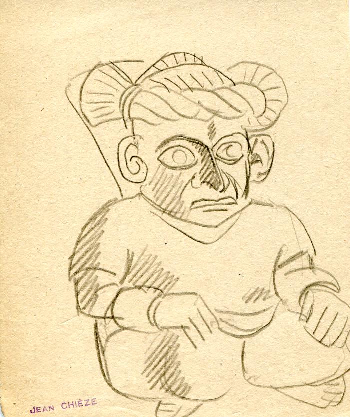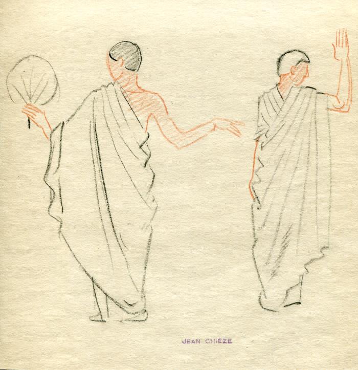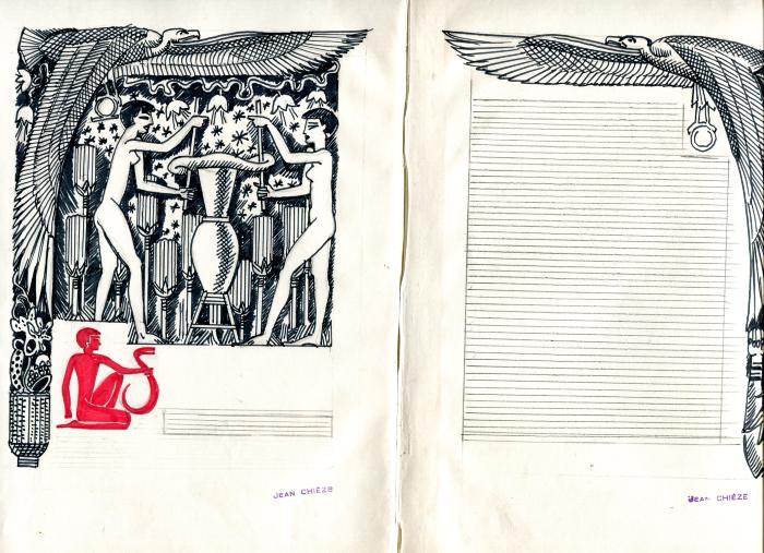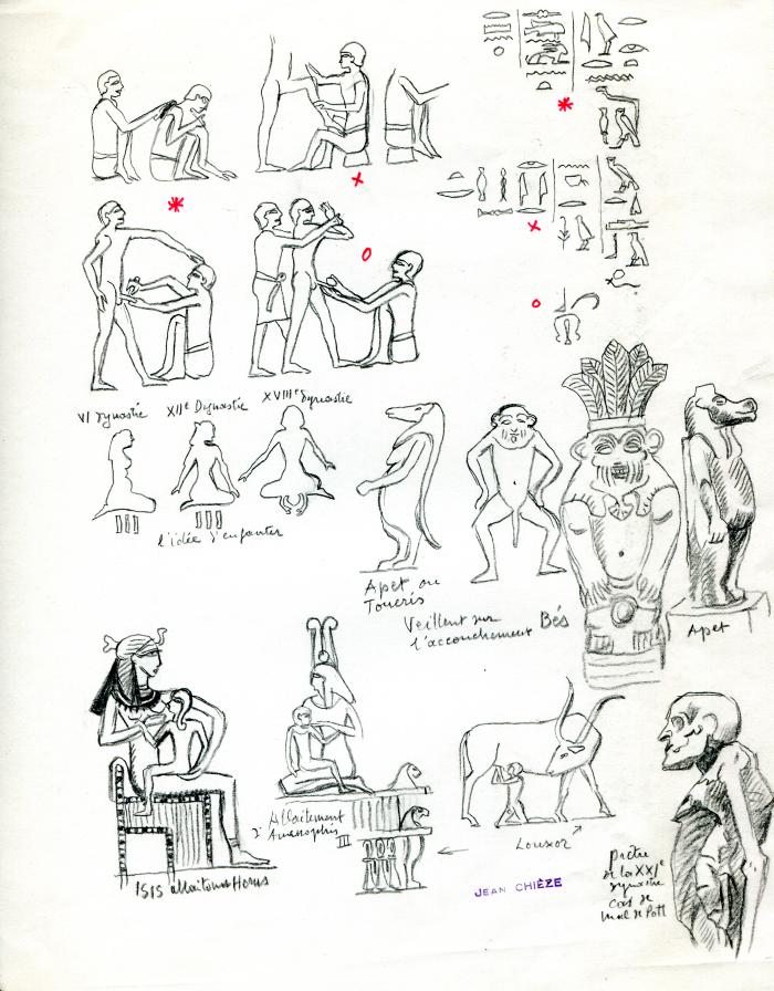 - 15 - Pochette : Egypte : Dessins préparatoires au crayon et à l'encre représentant des silhouettes de personnages égyptiens, et divers sujets issus de l'Art égyptien. Remarque : Certains sont légendés et tamponnés : Jean Chièze. Mises pages d'un ouvrage médical au crayon et à l'encre. Remarque : Toutes sont numérotées et tamponnées : Jean Chièze.