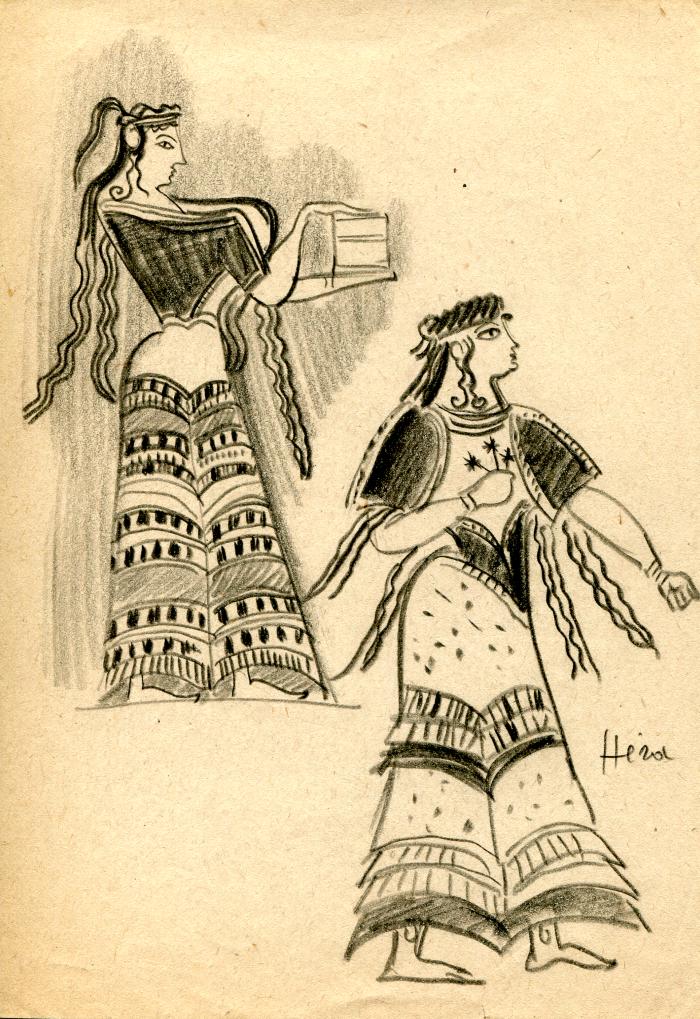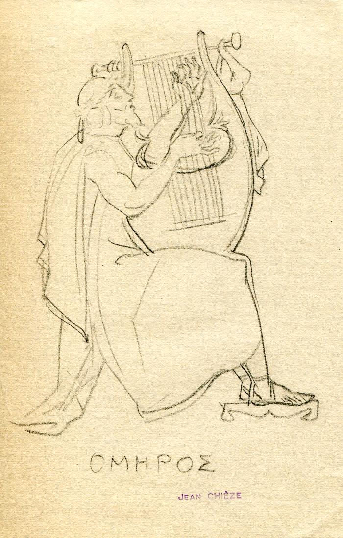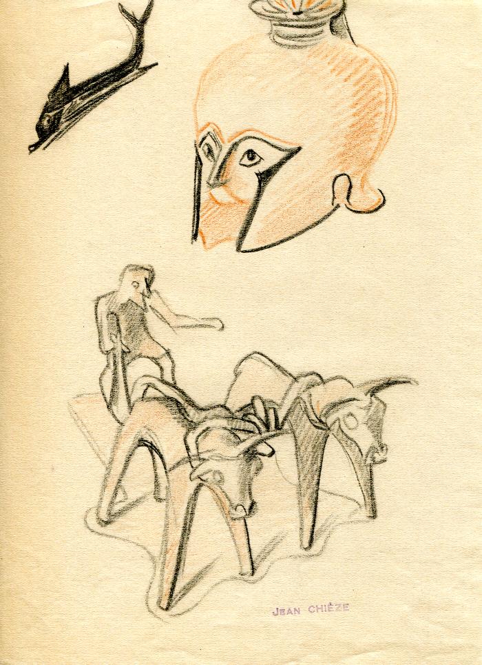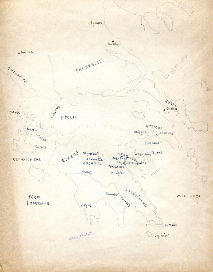 - 14 - Pochette : Grèce : Antiquités, divinités, personnages divers, professions : Dessins préparatoires au crayon représentant divers aspects de l'Art de la Grèce Antique : objets, sculptures, personnages, divinités et scènes d'époques, ainsi que des cartes détaillées. Remarque : Certains sont légendés et tamponnés : Jean Chièze. Documentation diverse (reproductions photographiques)