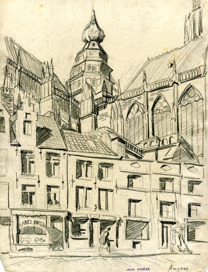 - 5 - Pochette : Belgique : Dessins préparatoires au crayon représentant des scènes de rues et du quotidien ainsi que l'architecture locale. Remarque : Certains sont légendés et tamponnés : Jean Chièze.